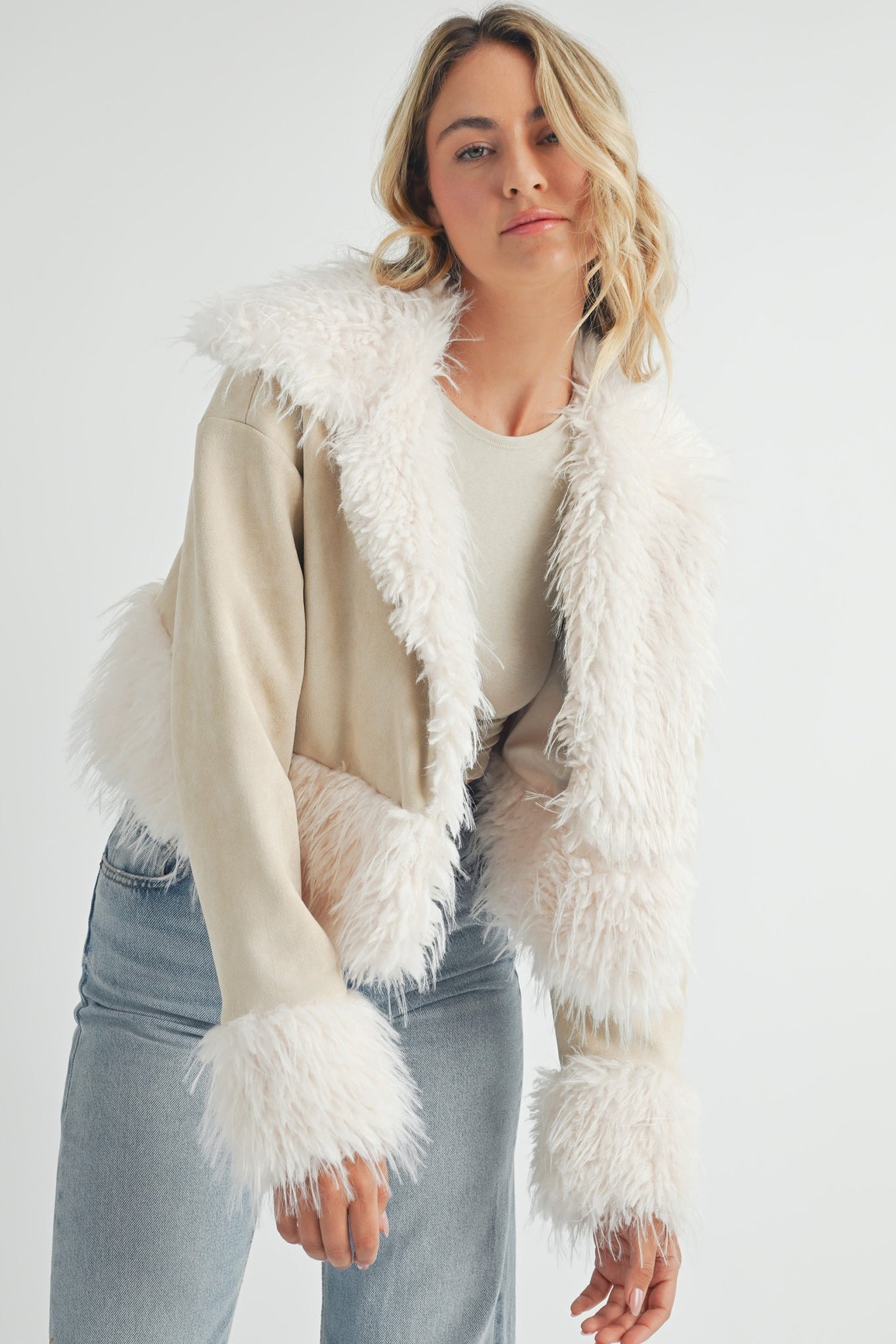 elevate your winter wardrobe with this cropped suede jacket featuring luxurious fuzzy fur trim along the cuffs, collar, and front edges. The open-front design offers effortless layering versatility, while the soft suede body provides warmth and timeless style. Perfect for pairing with your favorite sweaters and jeans for a cozy yet polished look.