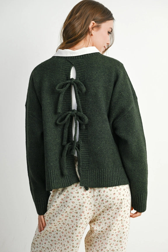 This cozy sweater combines comfort with style. The soft fabric drapes beautifully while the cropped fit creates a flattering silhouette. A charming tie-back detail at the open back adds a playful touch that elevates any outfit.