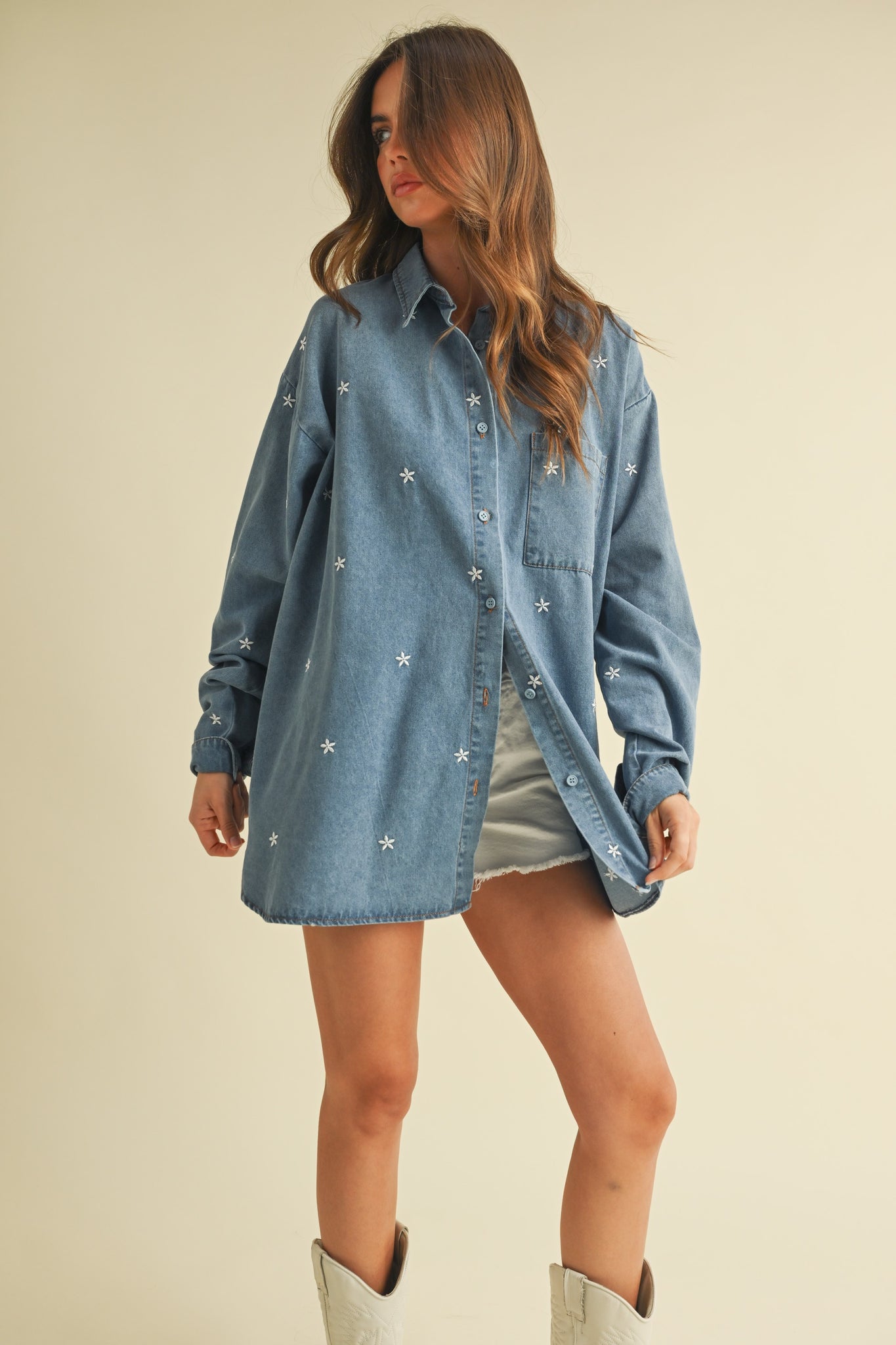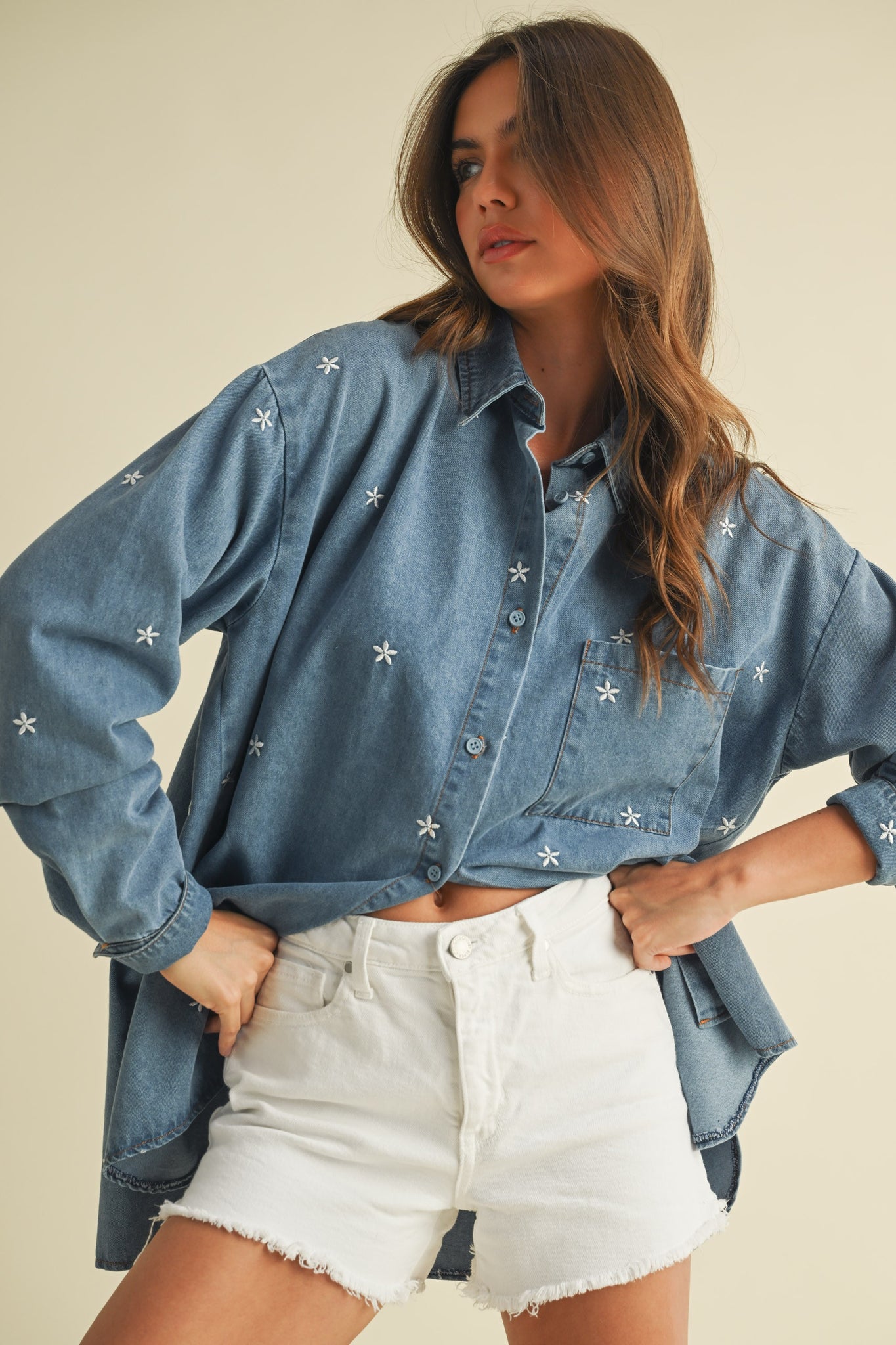 This oversized button-down features soft chambray fabric paired with delicate white flower embroidery scattered throughout, creating a romantic, understated look. Perfect for layering or wearing solo, it transitions seamlessly from casual weekends to relaxed workdays.