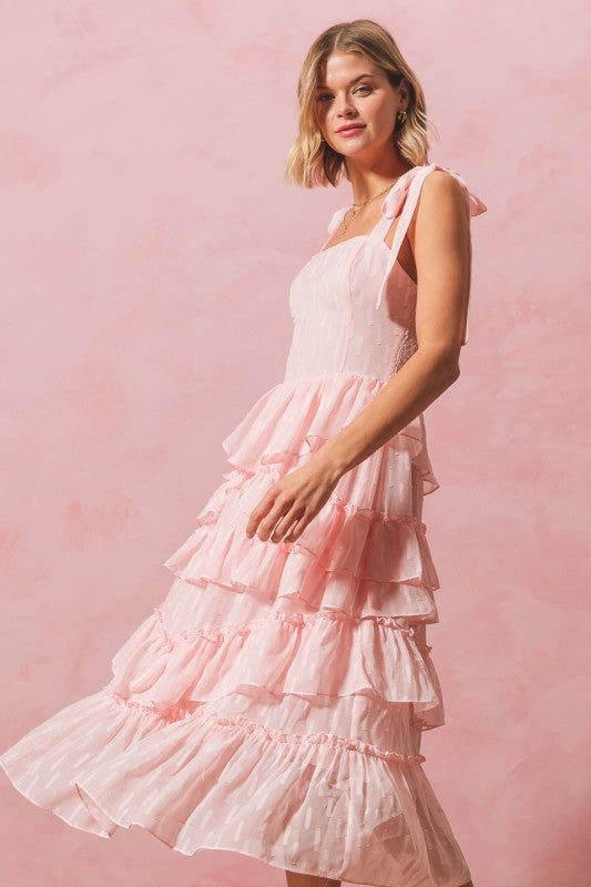Turn heads with this stunning tiered gown, featuring ribbon tie straps and a full skirt. The feminine silhouette offers a sculpted fit that beautifully enhances curves, while the delicate white tulle cascades into a midi length skirt. This tiered tulle maxi dress is a standout choice for weddings, formal soirées, or any moment you want to make truly unforgettable!