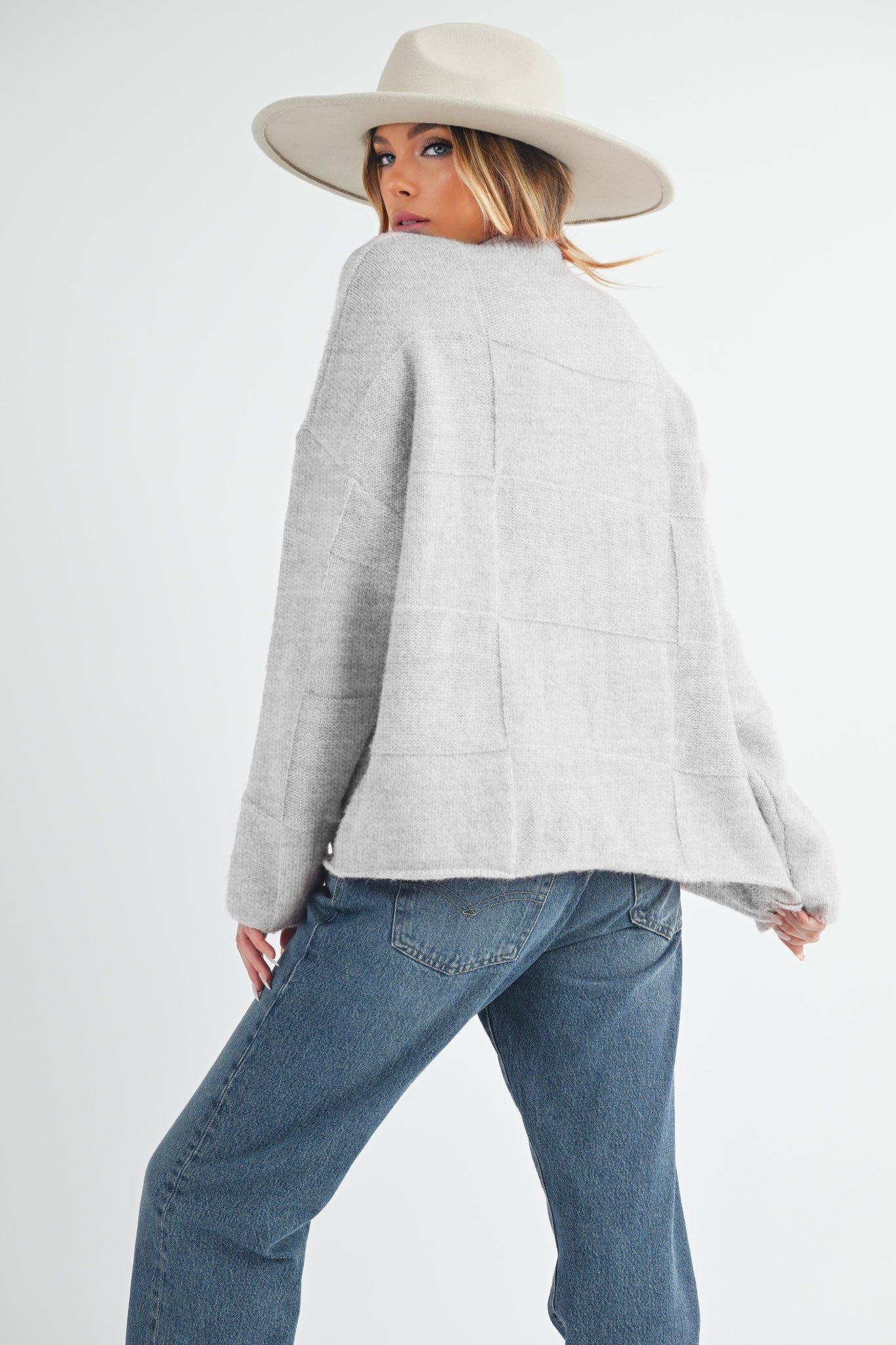 A cozy essential for the season. This mock neck sweater showcases a muted mixed-pattern patchwork, crafted to provide both style and warmth throughout the colder months.