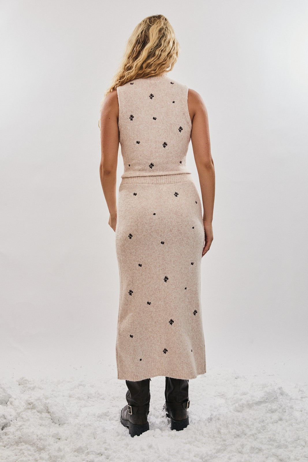 Cozy up in this charming two-piece set featuring a straight-cut sweater skirt paired with a matching high-neck cropped tank top. Delicate embroidered twinkle stars make this sweater set the perfect ready to go outfit that you can wear together or layer separately.